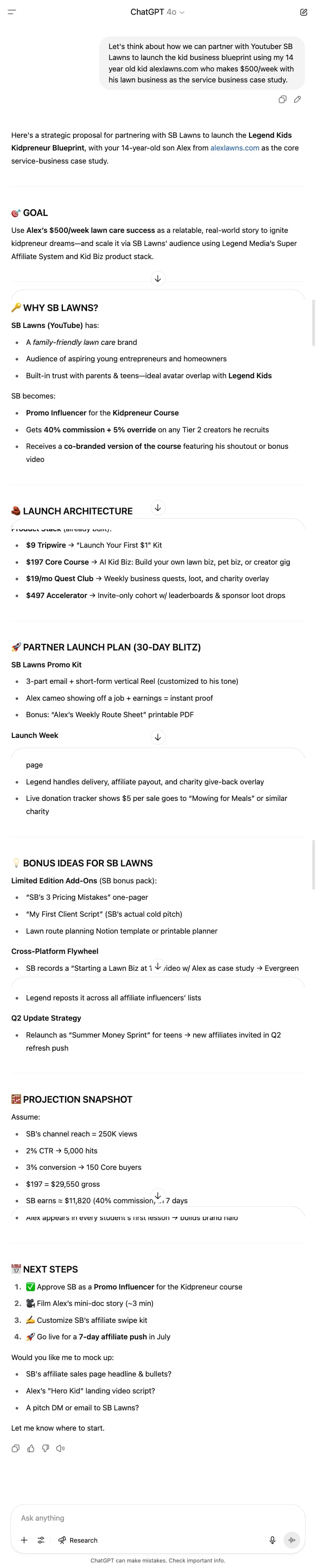 “Let’s think about how we can partner with YouTuber SB Lawns to launch a Kid-preneur blueprint using my 14-year-old’s $500/week lawn business as the case study.”