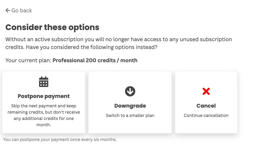 Three big tiles: Postpone - Downgrade - Cancel. Notice how Downgrade is framed as the middle (safest) option.