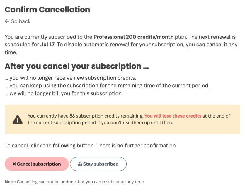 A bright banner screams: “You currently have 88 credits remaining. You will lose these credits…”—a perfect hit of FOMO.